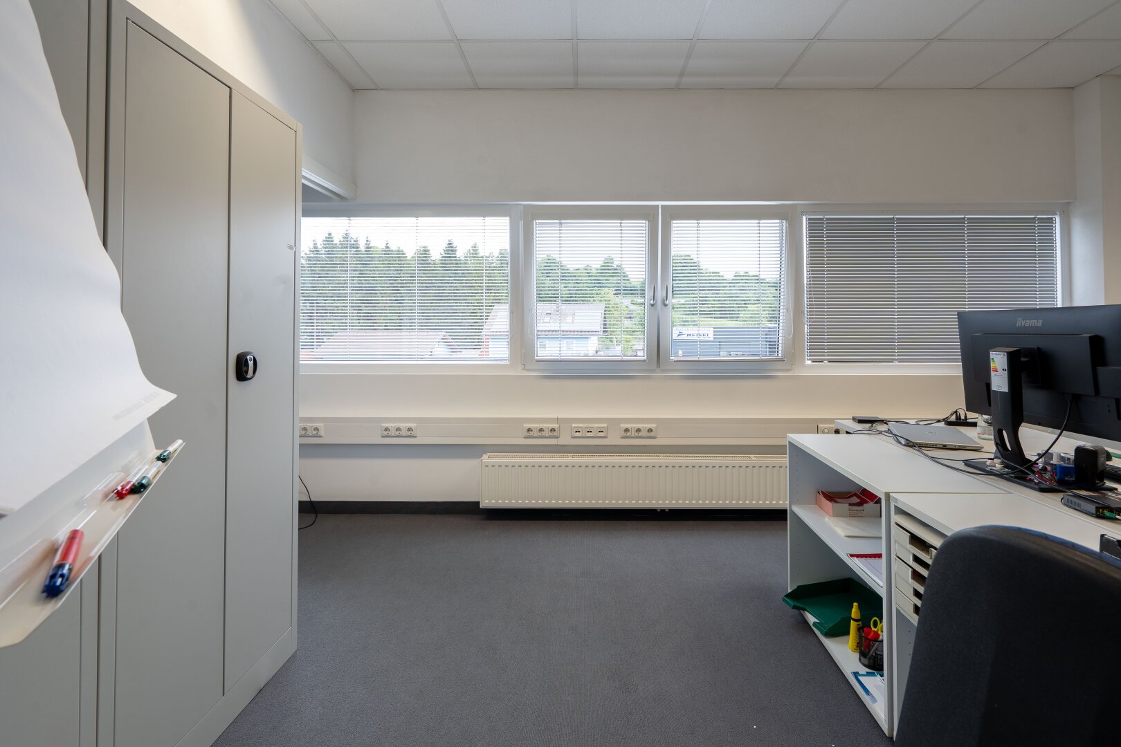 Das Büro im Erdgeschoss ist hell und funktional geschnitten und kann optimal für Verwaltung, Empfang oder Kundenkontakt genutzt werden. Das Obergeschoss-Büro überzeugt durch einen großzügigen Schnitt und die integrierte Küche, die als Pausen- oder Besprechungsbereich dient und den Arbeitsalltag komfortabel gestaltet. Sanitäre Einrichtungen für Damen und Herren befinden sich in der Gewerbehalle und stehen den Mietern beider Büros zur Verfügung.