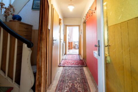 Beim Betreten des Hauses gelangen Sie in einen einladenden Vorraum, der einen direkten Zugang zu allen Bereichen des Erdgeschosses ermöglicht. Rechts liegt das gemütliche Wohnzimmer, links führt eine Wendeltreppe ins Obergeschoss. Ebenfalls vom Vorraum aus erreichbar sind die Küche und das Badezimmer. Über eine Tür gelangen Sie in den Keller, der den Heizraum, eine Werkstatt und einen weiteren Kellerraum umfasst.