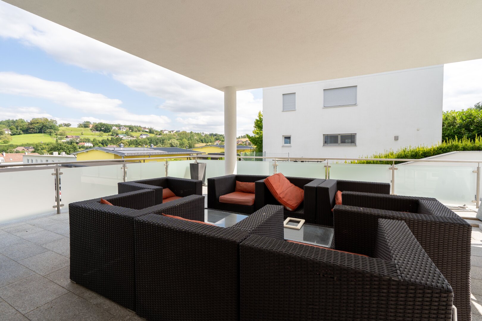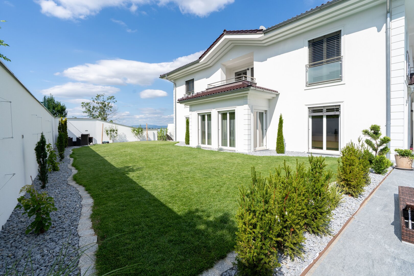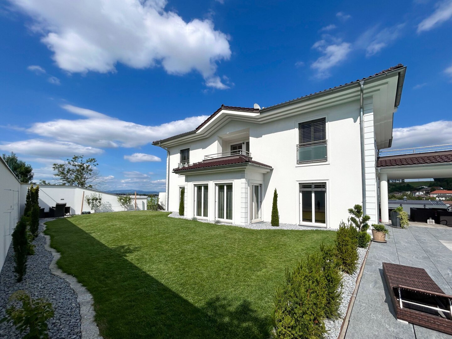 Das Haus ist in einem sehr gepflegten Zustand und besticht durch seine hochwertige Ausstattung. Die Terrasse ist der perfekte Ort, um die Aussicht auf den Grünblick zu genießen und sich zu entspannen. Zwei Garagen bieten genügend Platz für Ihre Fahrzeuge und auch für zusätzlichen Stauraum.