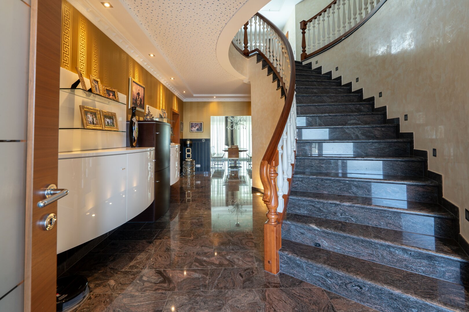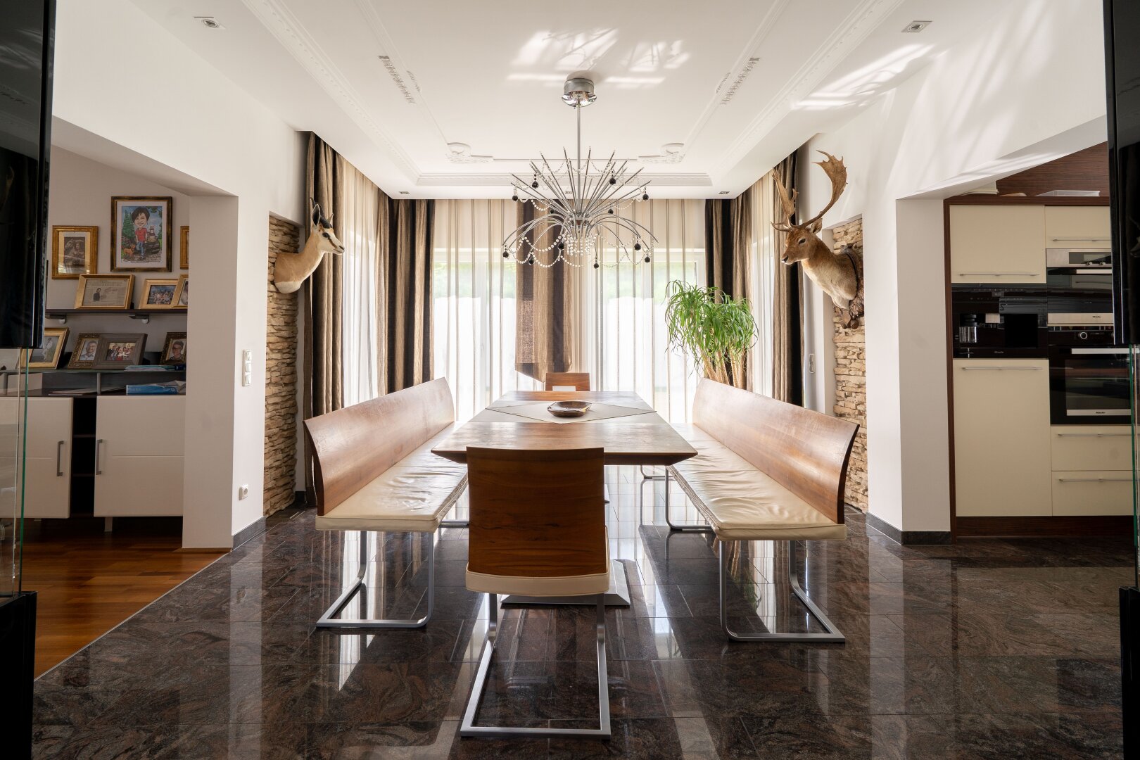 Innen erwartet Sie ein modernes und stilvolles Ambiente. Hochwertige Fliesen und Parkettböden sorgen für ein edles Erscheinungsbild. Eine Fußbodenheizung sorgt für wohlige Wärme an kalten Tagen. Die Einbauküche bietet Ihnen alle Annehmlichkeiten, die Sie für die Zubereitung Ihrer Lieblingsgerichte benötigen.