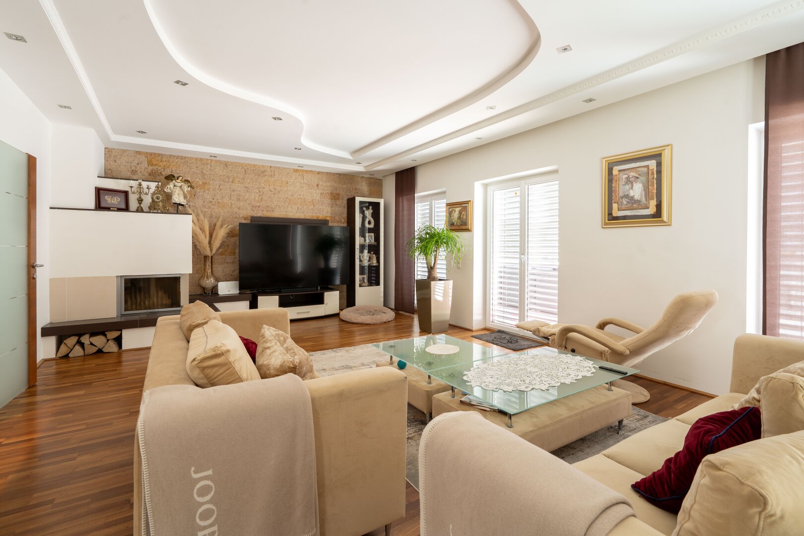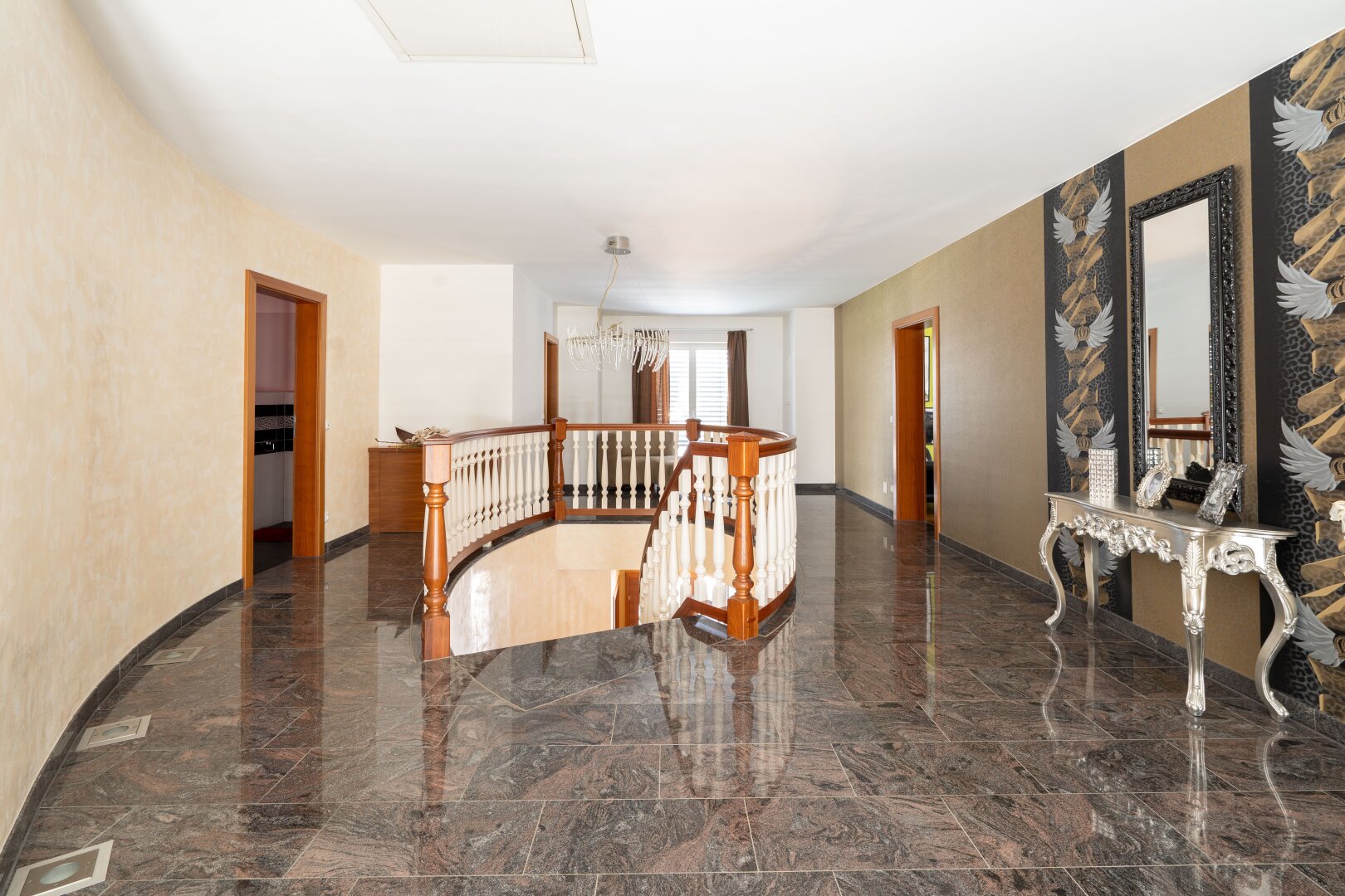 Vorraum - Wohnzimmer mit Kamin - Küche - Esszimmer - Schlafzimmer - drei Kinderzimmer - Galerie - drei Badezimmer - zwei WCs - eine Terrasse - zwei Balkone